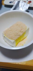 材料は素と木綿豆腐を混ぜるだけ。乾燥卵黄が入っているそうで豆腐が白身のようになるという感じです。